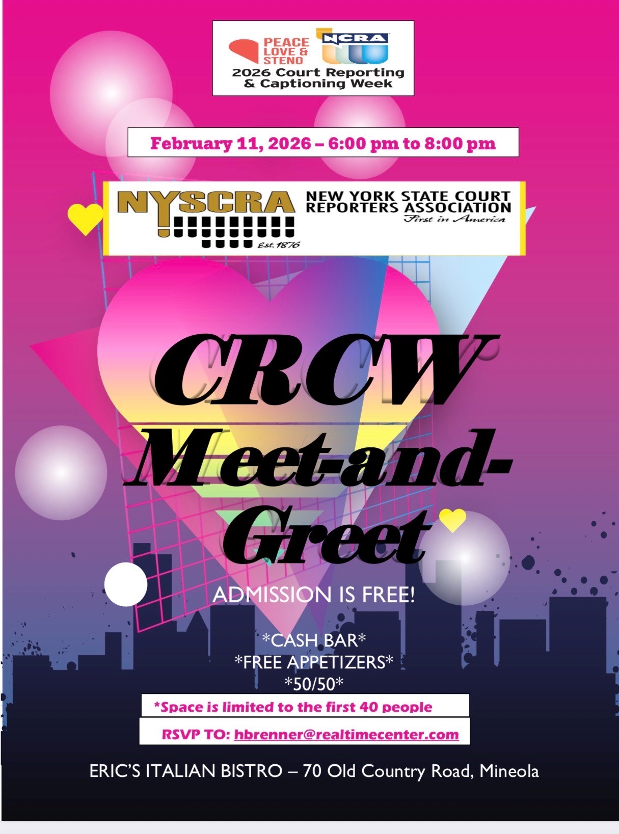 Come celebrate Court Reporting and Captioning Week with NYSCRA on Long Island at Eric's Italian Bistro in Mineola from 6:00 p.m. to 8:00 p.m. This will be a great networking opportunity for professional reporters, CART providers, and students. There will be free appetizers and a chance to win a 50/50 raffle. Admission is free but space is limited, so please RSVP! There will be a cash bar. RSVP to: [email protected]